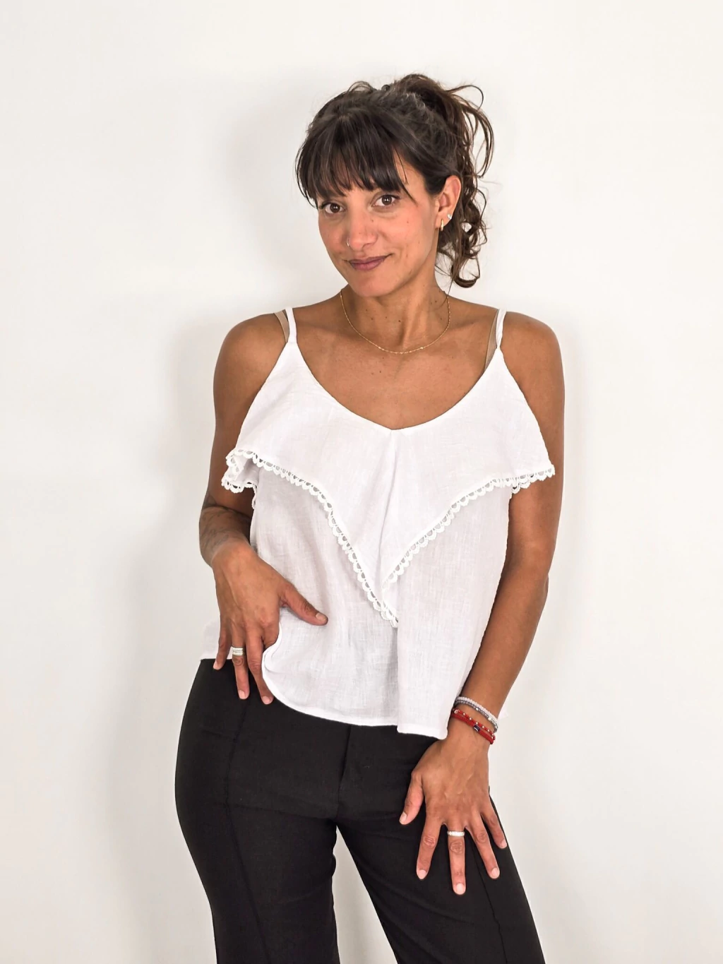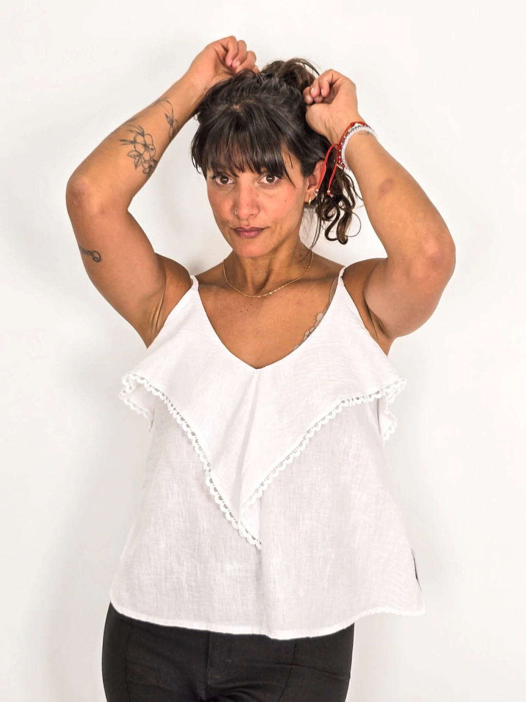 Blusa de Lino Jaspeado con Volados y Puntilla – Elegancia Atemporal