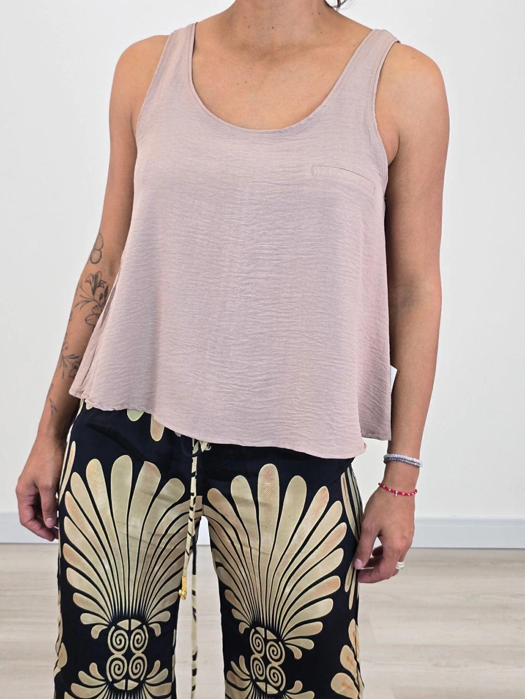 Esta musculosa es la opción ideal para quienes buscan una prenda versátil que combine comodidad y diseño con un toque sofisticado. Perfecta para días de calor o para combinar con chaquetas livianas en las tardes más frescas.