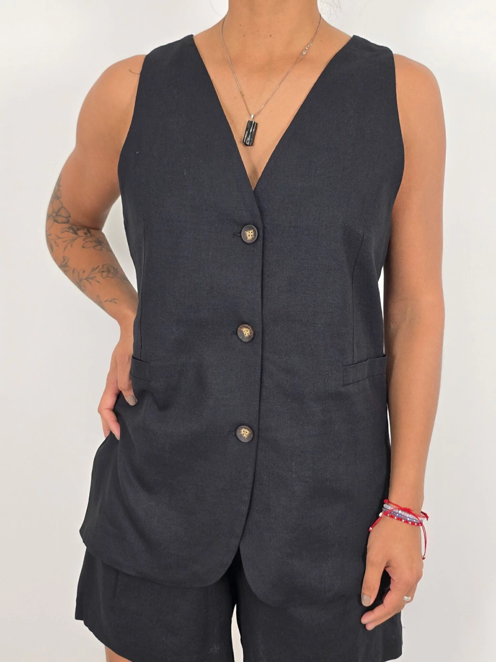 Este chaleco, completamente forrado y con botones, presenta un diseño moderno con tajos laterales que aportan movimiento y versatilidad a tu look. El lino natural asegura frescura y una textura suave, perfecta para la temporada.