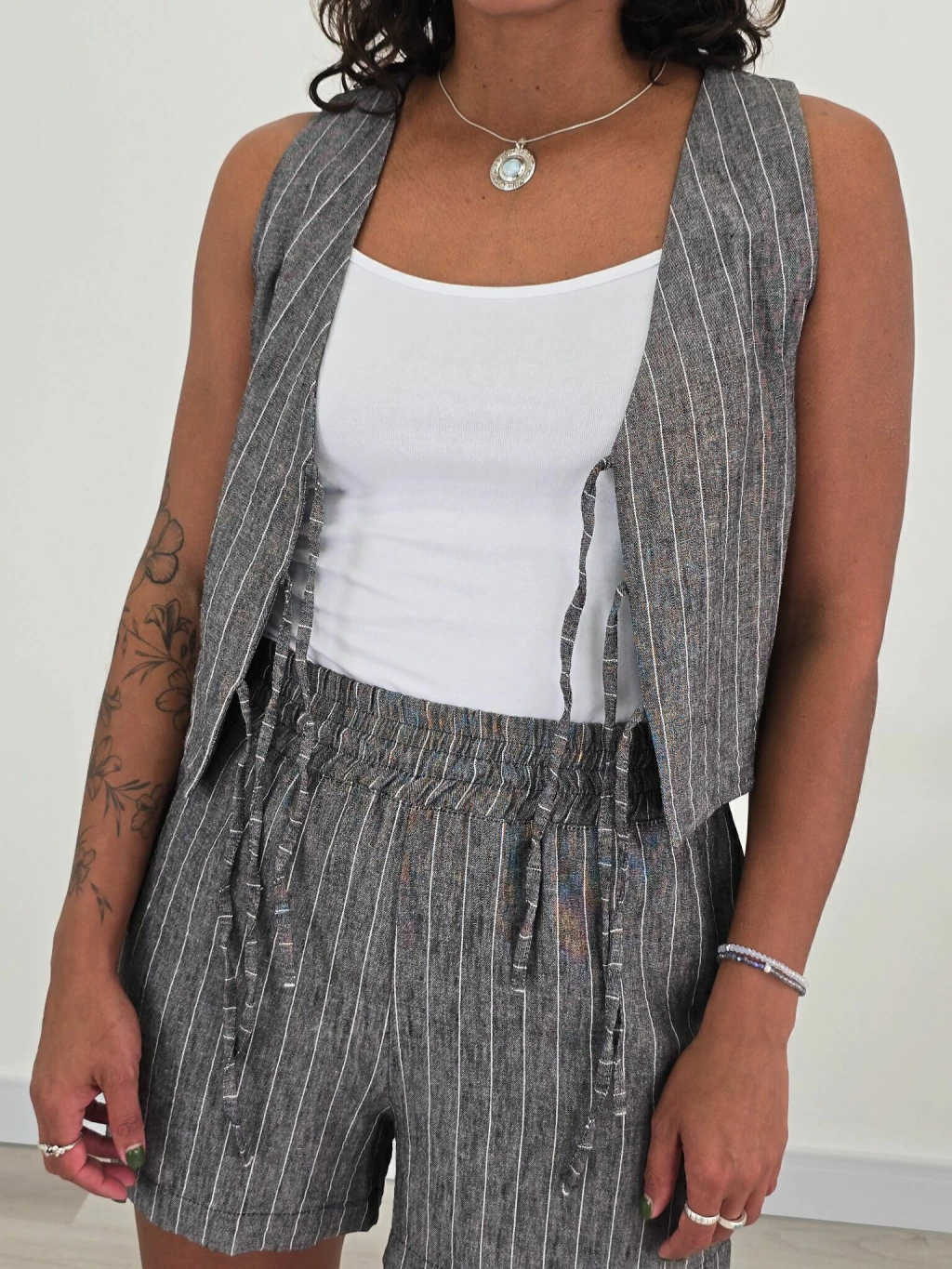 Descubrí la sofisticación y versatilidad de nuestro Chaleco de Lono, una prenda que transformará tu guardarropa con su diseño único y detalles exclusivos. Este chaleco se ata en la parte delantera, eliminando la necesidad de botones, y cuenta con una elegante pinza Dior que realza su estilo y comodidad.