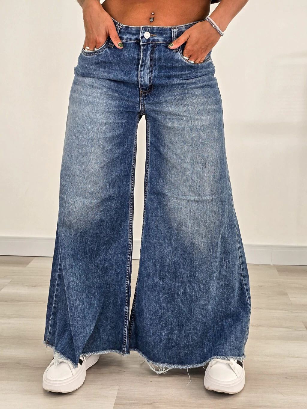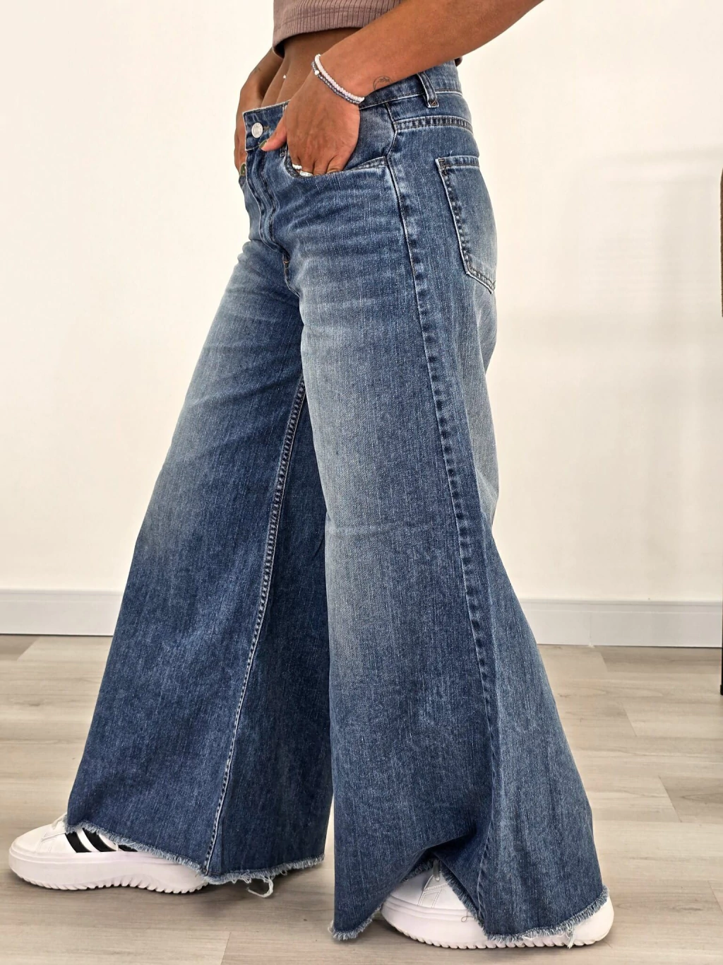 Descubrí el Palazzo de Jeans Rígido con tiro medio, diseñado para combinar la elegancia y la comodidad que buscás en tu día a día. Con un estilo clásico de 5 bolsillos y un ruedo al corte, esta prenda se adapta perfectamente a tus looks casuales y urbanos.