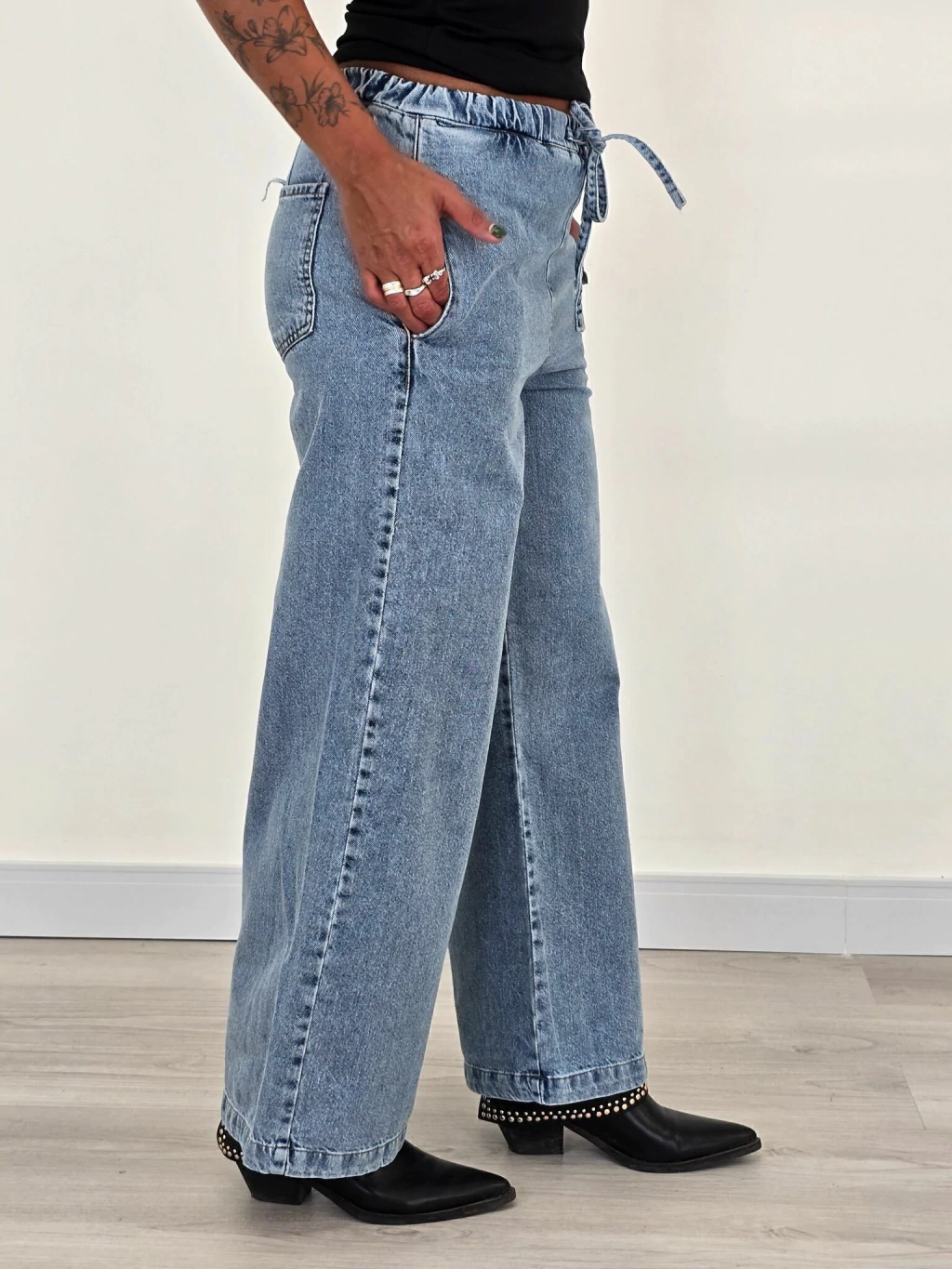 Este pantalón pijamero en denim rígido es un básico imprescindible para renovar tu guardarropa con un toque moderno y confortable. ¡Animate a lucir un estilo único y cómodo todos los días!