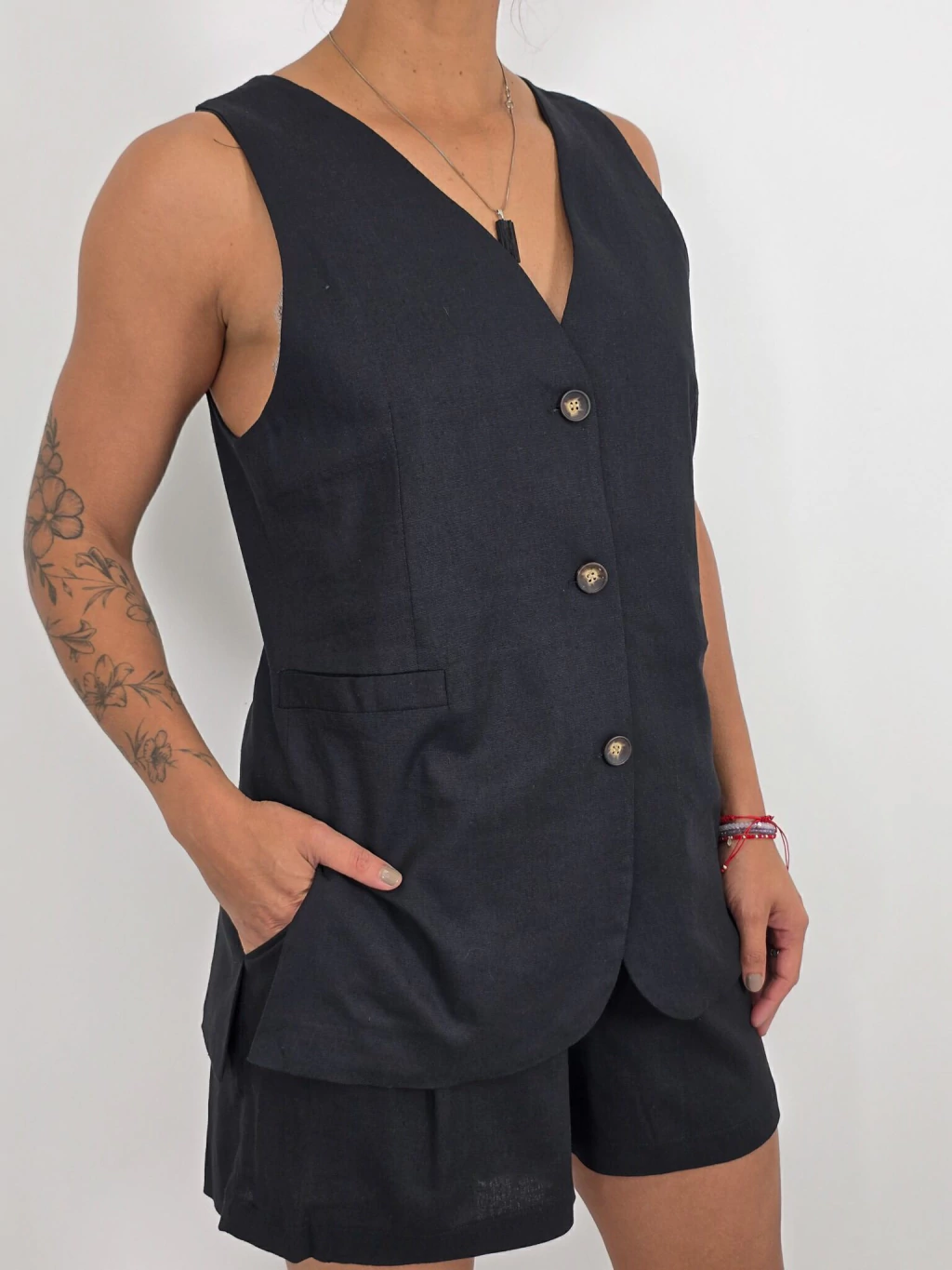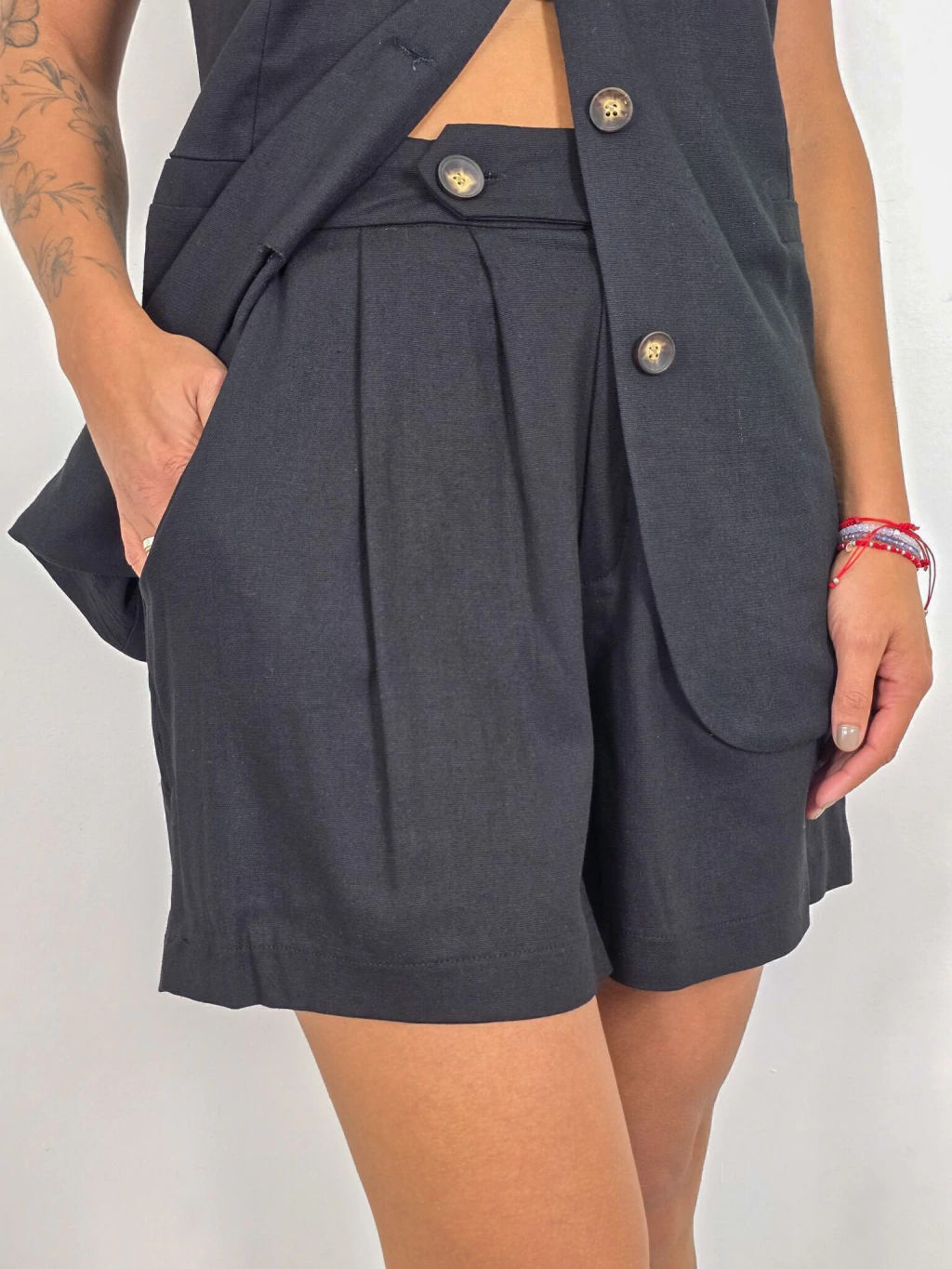Ideal para crear un match perfecto con nuestro chaleco, este short es imprescindible para quienes buscan estilo y frescura en cada outfit.