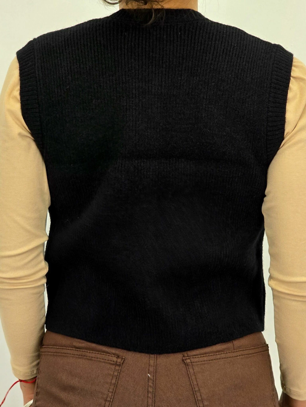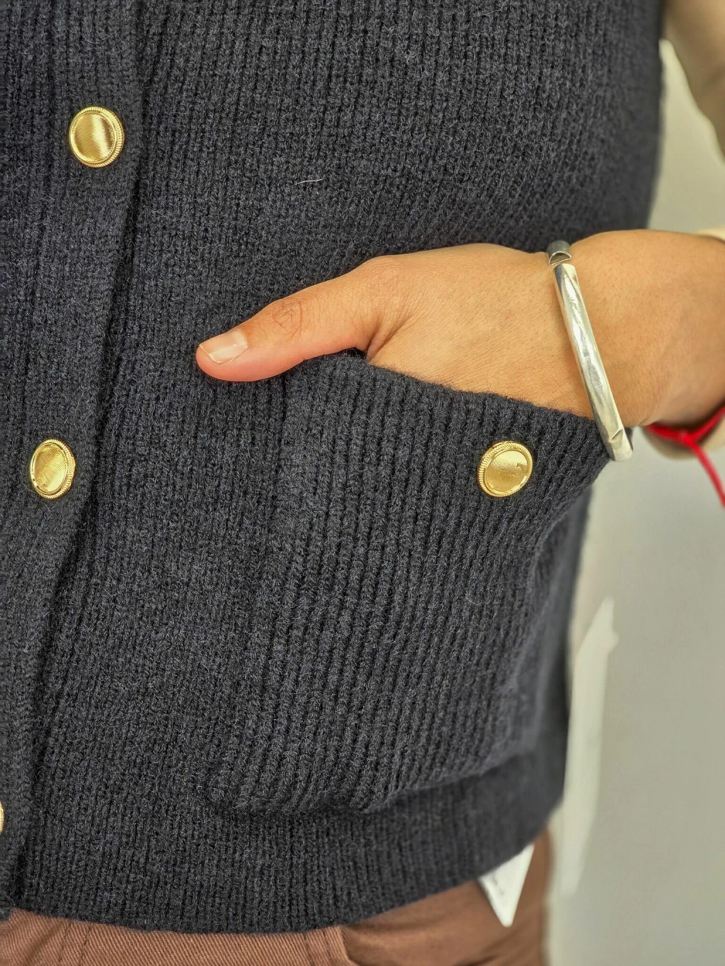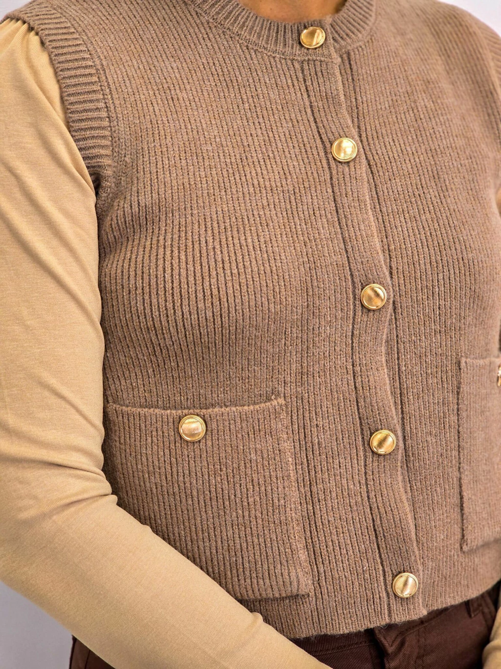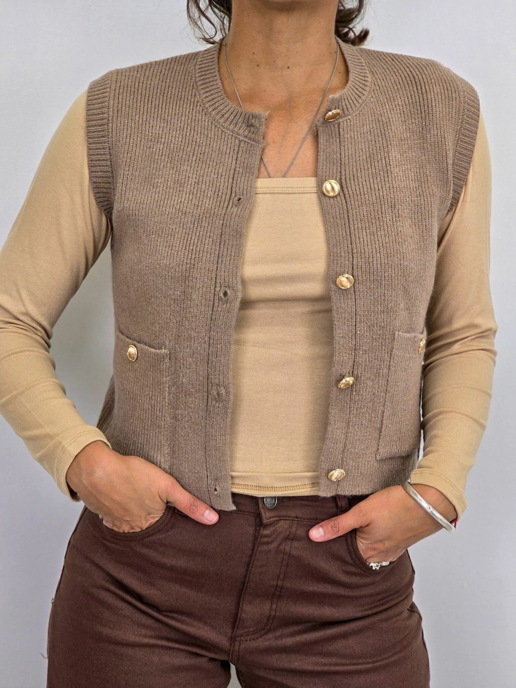 Descubrí el Chaleco Tejido con Botones Dorados, una prenda que aporta un aire de sofisticación a cualquier outfit. Perfecto para combinar con camisas o remeras, este chaleco se convierte en un básico esencial para tu guardarropa.