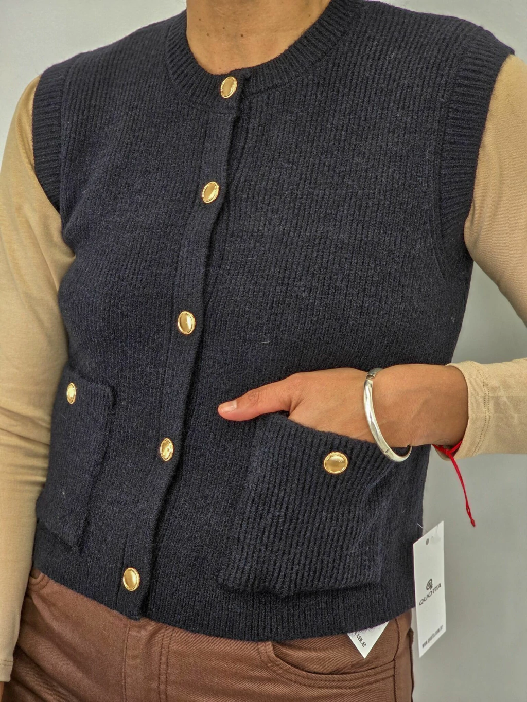 ¡No dejes pasar la oportunidad de añadir este Chaleco Tejido con Botones Dorados a tu colección! Es la prenda ideal para lucir elegante en cualquier ocasión. ¡Sumalo hoy mismo a tu carrito y redefine tu estilo!