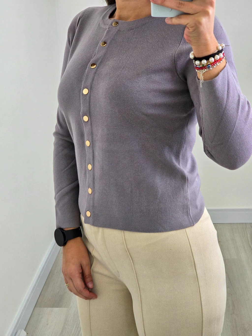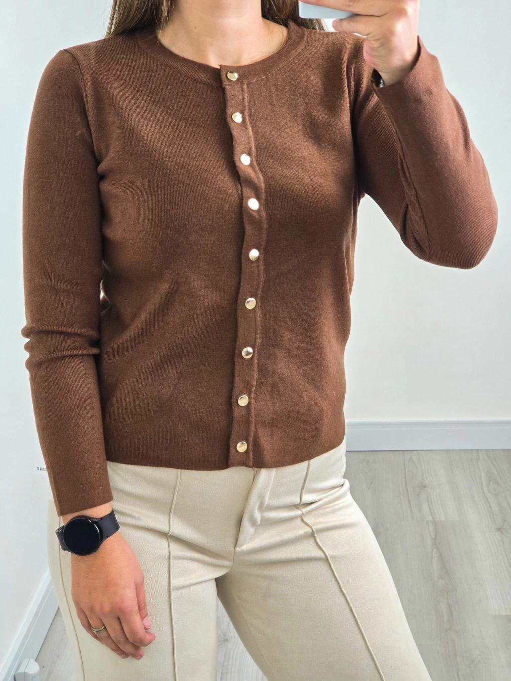 Descubre la elegancia y el confort con nuestro Cardigan con Botones que se Abrochan en Color Dorado. Este exquisito cardigan cuenta con un escote redondo que resalta la figura, convirtiéndolo en una opción perfecta para cualquier ocasión.