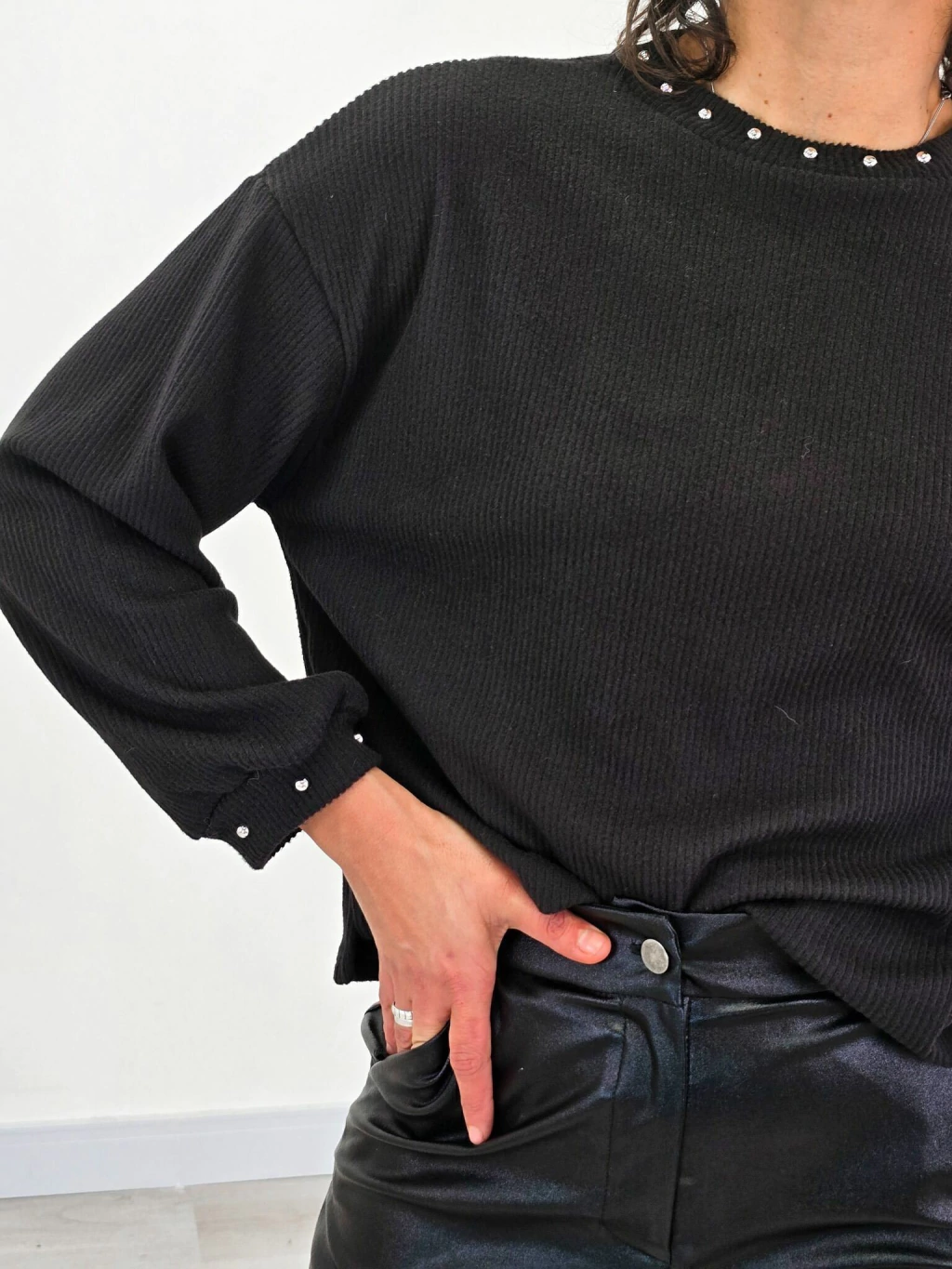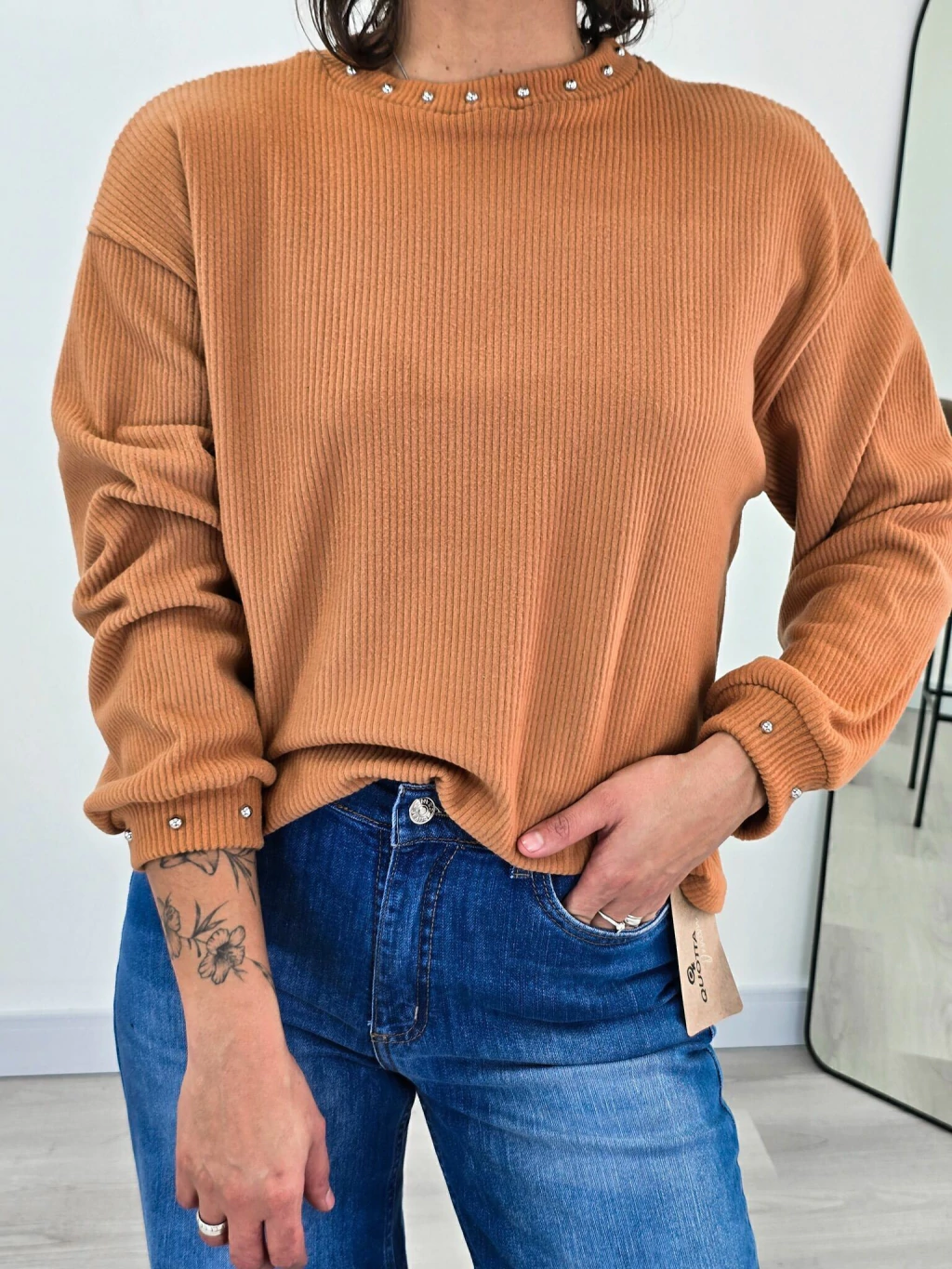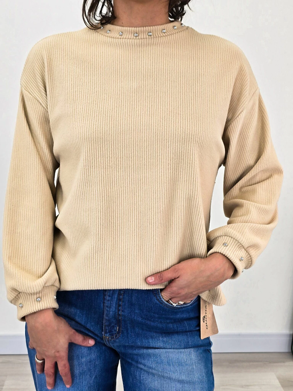 Sweater de Lanilla Bifaz con Tachas en Cuello y Puños: Estilo y Versatilidad en Cada Detalle