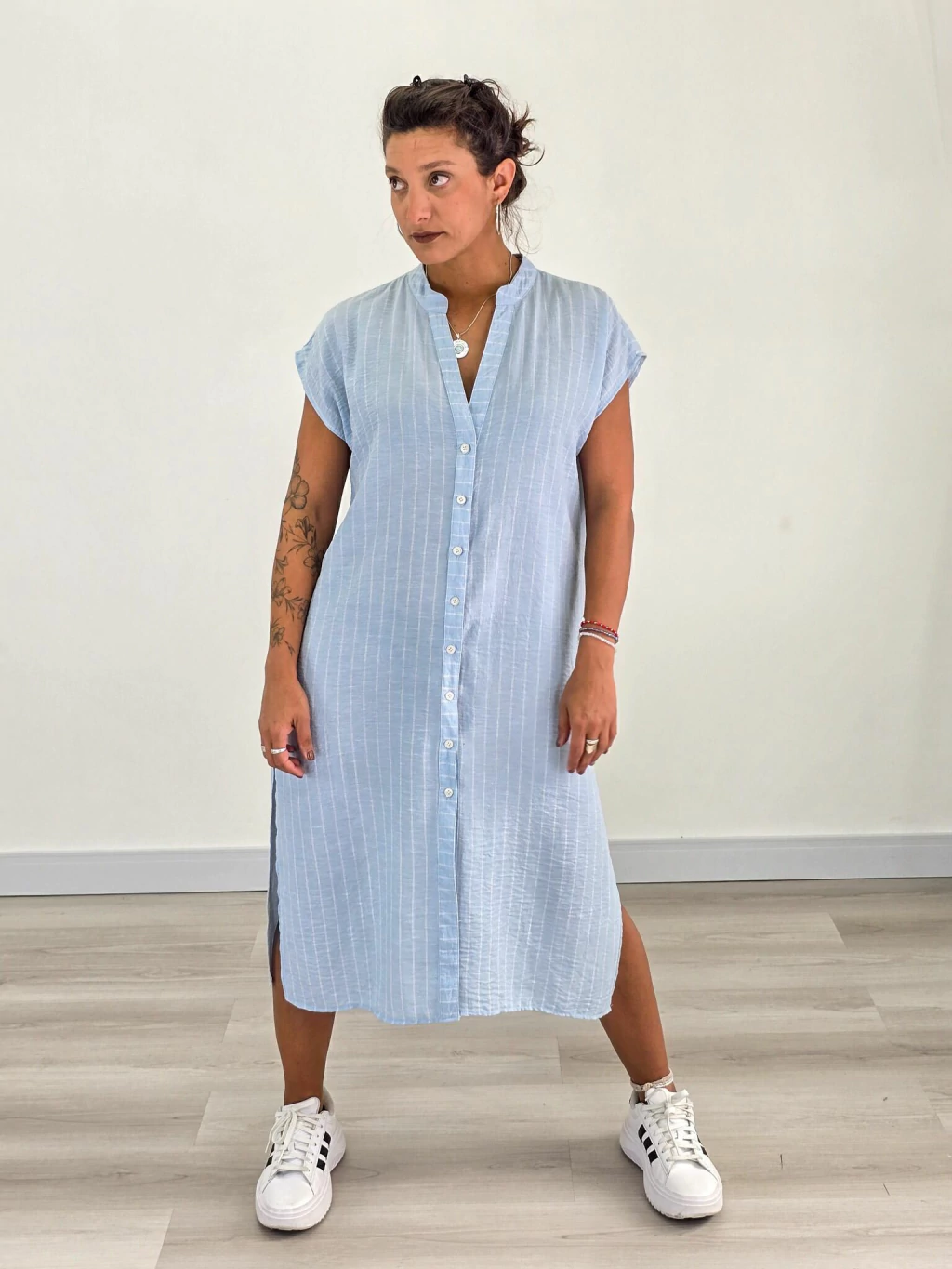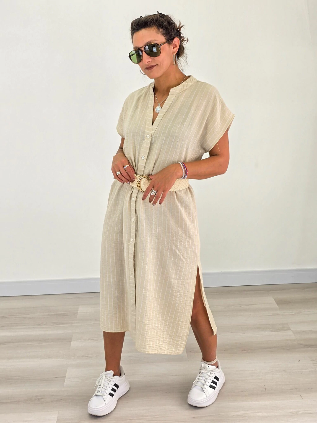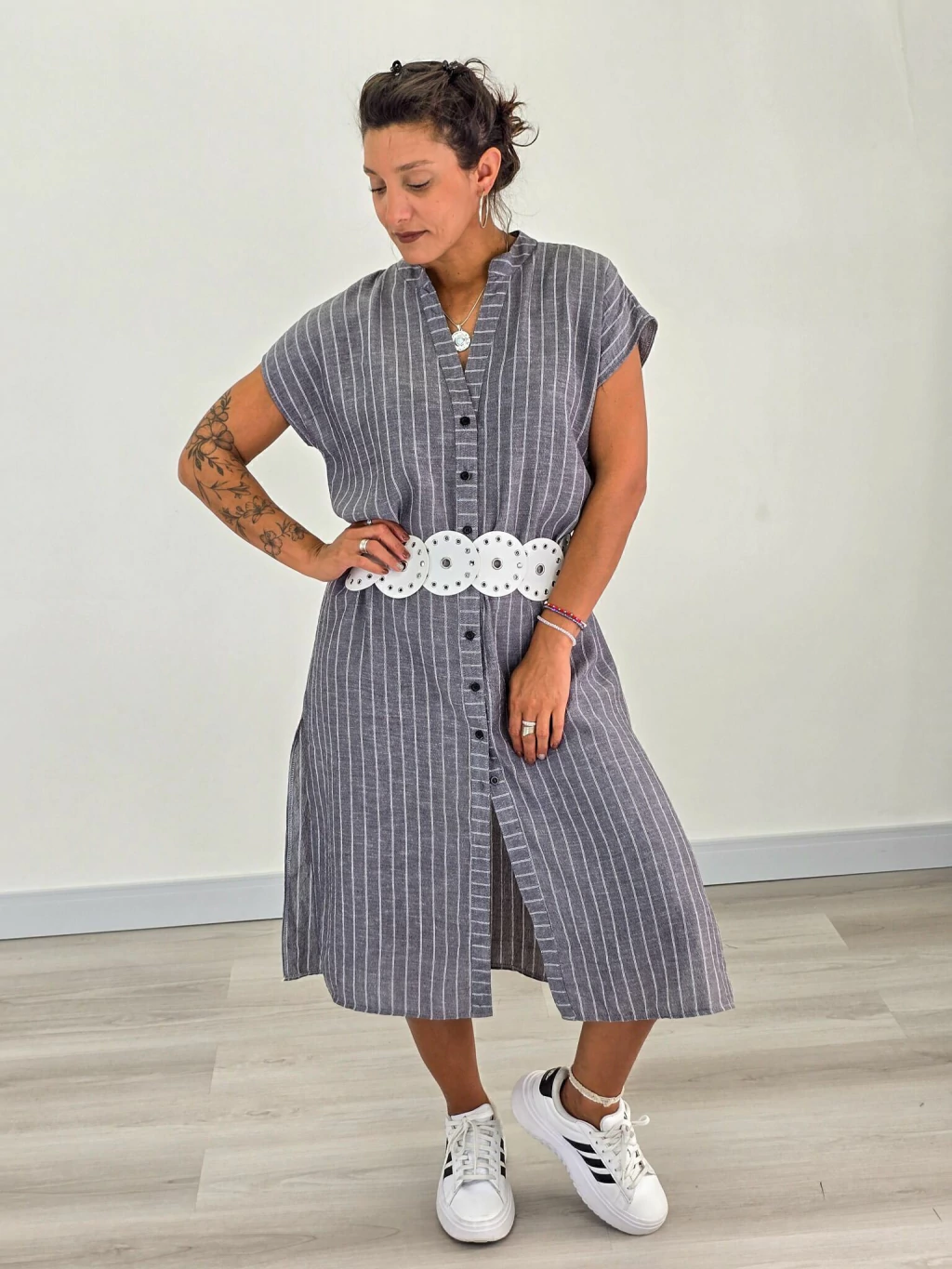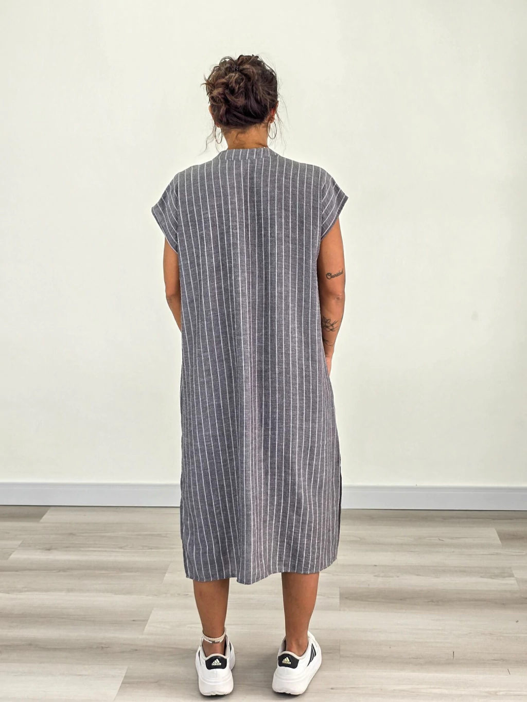 Descubrí el Vestido Túnica Camisero que combina a la perfección estilo y comodidad para tus días más especiales. Confeccionado en lino rayado de alta calidad, este vestido es la elección ideal para quienes buscan una prenda fresca, ligera y con un diseño que realza tu figura.