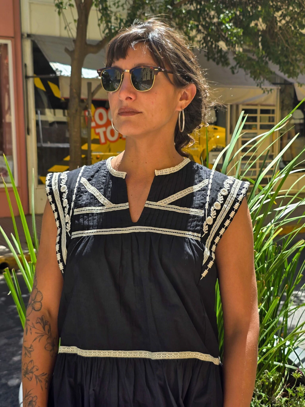 Este vestido corto, confeccionado en suave voile, destaca por sus bordados y puntillas en recortes que aportan un toque artesanal y sofisticado. Ideal para quienes buscan una prenda femenina y fresca.